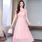 พร้อมส่ง !! ชุดเดรสลูกไม้สีชมพู แขนสั้น กระโปรงทรงบานคลุมเข่า แนวเรียบร้อย สวยดูดี ชุดเดรสทำงาน ชุดเดรสออกงาน ชุดเดรสไปงานแต่ง ครบจบด้วยชุดนี้แหละ
