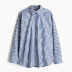 เสื้อเชิ้ตทรงหลวมในผ้าคอตตอน เนื้อเบา คอปก ติดกระดุมผ่าหน้า แต่งเย็บต่อเสื้อแบบจับจีบทบด้านหลัง มีกระเป๋าปะที่หน้าอก ไหล่ตก แขนยาว ติดกระดุมปลายแขน ชายเสื้อโค้งเล็กน้อย